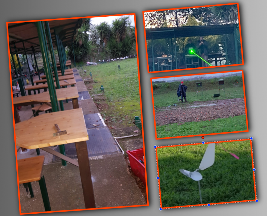 Tutte le avversità del momento non ci hanno fermato, così, dopo aver dato una sistemata alla tettoia, abbiamo prima allineato i tavoli, poi centrati i porta bersagli con il laser…..
