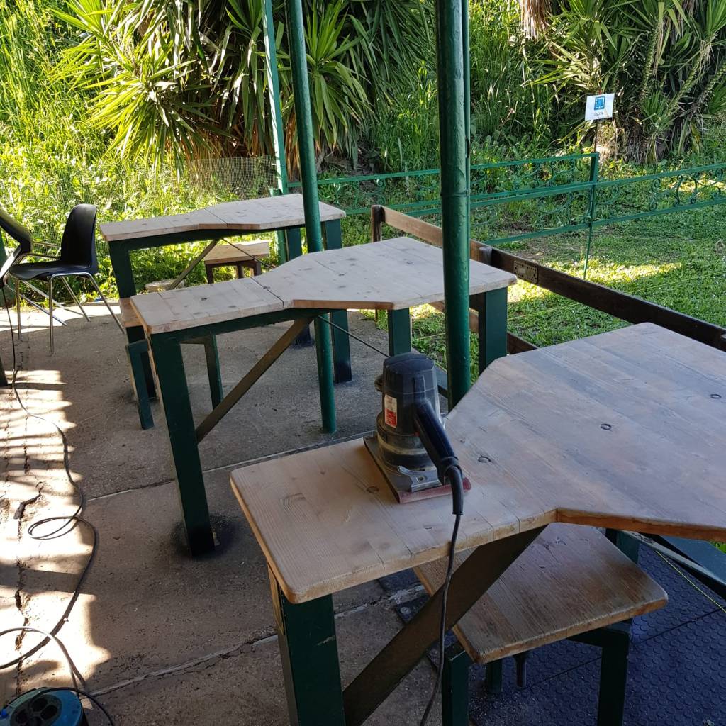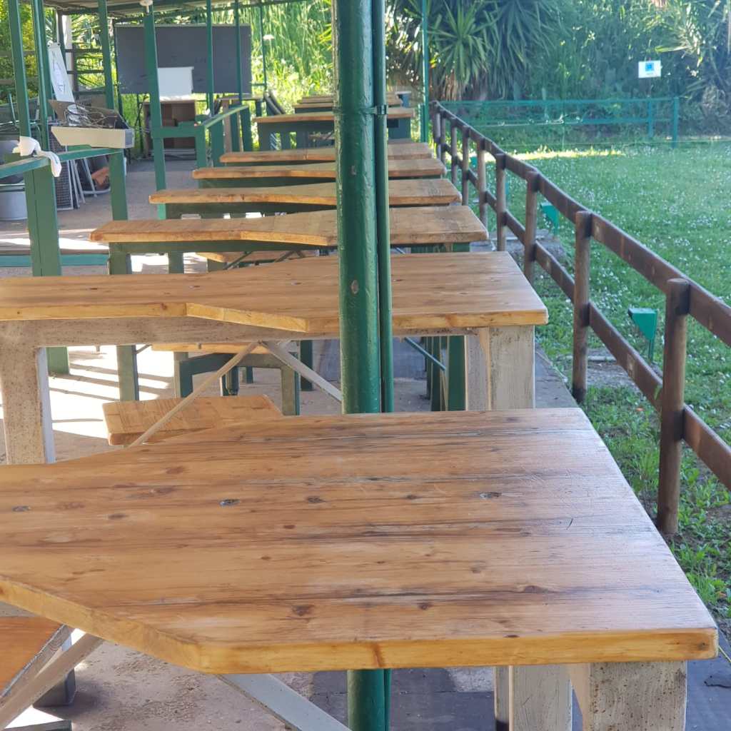 Sono stati trattati anche tutti i tavoli e le sedute, carteggiandoli e proteggendo il legno con varie mani di impregnante…
