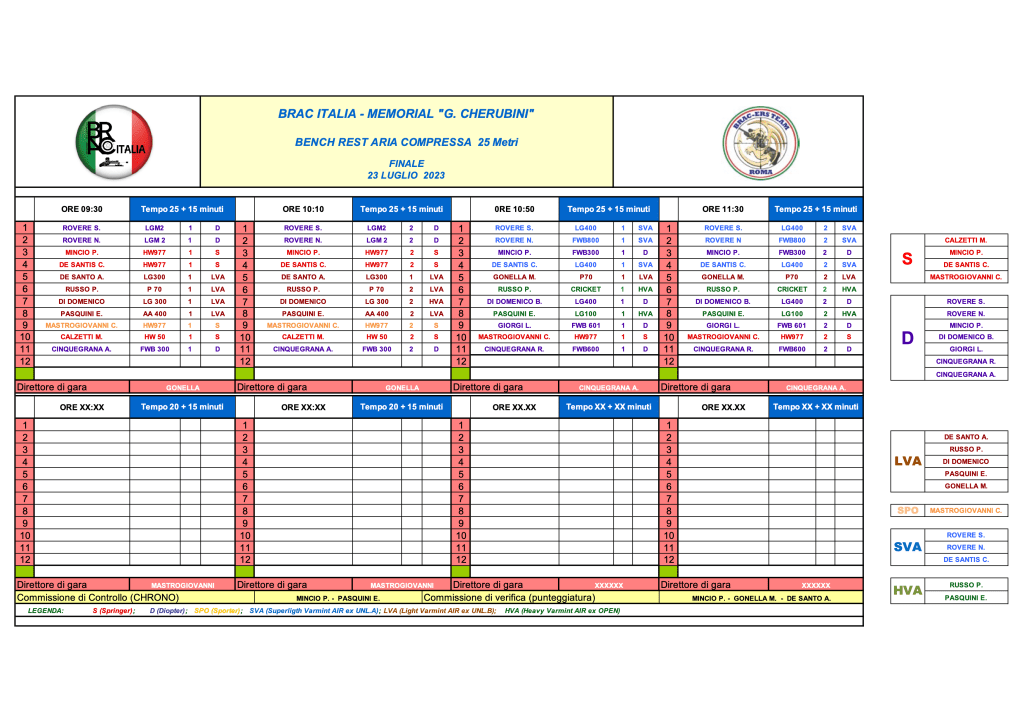 La gara avrà inizio alle ore 09,30 di Domenica 23 Luglio 2023 . Per le categorie per cui sono previste, tutti i concorrenti dovranno sottoporre preventivamente le proprie carabine ai controlli chrono, pena l’esclusione dalla finale.