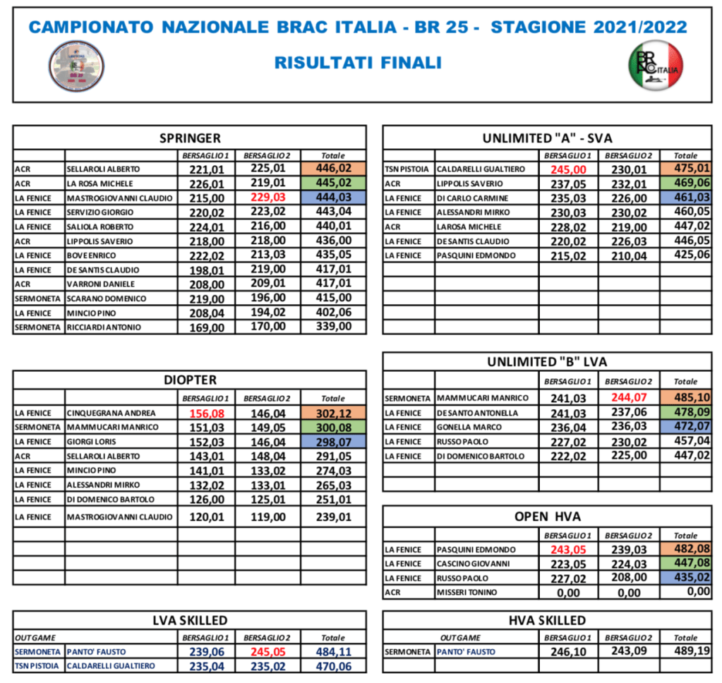 CAMPIONATO BRAC ITALIA LIBERTAS BR 25 – 2021/2022 – FINALE – MAGGIO 2022 Di seguito le graduatorie finali di campionato: fCAMPIONATO NAZ. RISULTATI FINALE – MAGGIO 2022Download Condividi: Condividi su X (Si apre in una nuova finestra) X Condividi su Facebook (Si apre in una nuova finestra) Facebook Mi piace Caricamento...