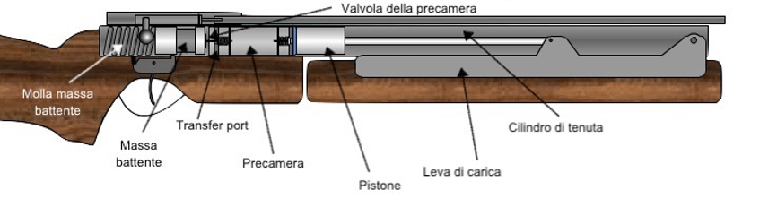 Attraverso la valvola della precamera, l’aria a pressione, transitando per la transfer port, raggiungerà la parte posteriore del pallino, imprimendogli l’energia cinetica che lo proietta all’esterno della canna, verso il bersaglio.