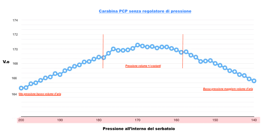 Nella precamera perverrà aria a pressione +/- analoga a quella del serbatoio. Pertanto la spinta che fornirà al pallino si manterrà pressochè costante. Poi, diminuendo pressione nel serbatoio, il volume d’aria che verrà trasferito nella precamera aumenterà ma, nel contempo, risentirà del calo di pressione. L’aria di spinta che arriverà al pallino sarà di minore intensità.