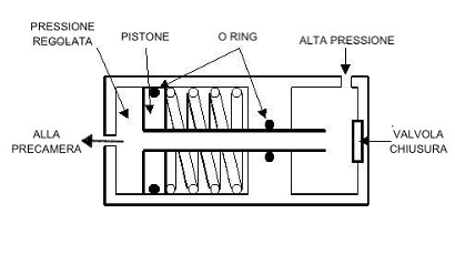 Con il pistone a fine corsa, l’aria all’interno della camera “pressione regolata” assumerà un valore di pressione pari all’energia che gli necessita per contrastare quella della molla di spinta del pistone e farlo arretrare fino al suo fine corsa. Regolando, a priori, la forza della molla si riesce, pertanto, a stabilire un livello di pressione costante all’interno della camera. Almeno fino a che l’alta pressione proveniente dal serbatoio non diminuisca d’energia fino ad eguagliare quella della molla di spinta del pistone.