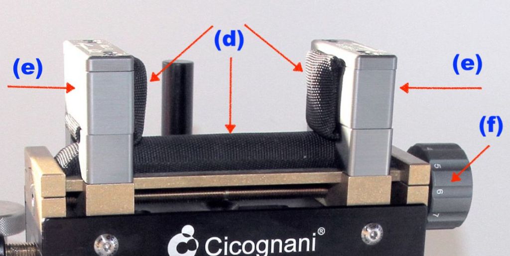 Una manopola (f) agisce sulle due guance (e) che scorrono sulla parte piatta della testa aprendosi e chiudendosi. In tale modo l’alloggiamento può regolarsi a piacimento del tiratore, adattandosi quindi, a differenti tipologie di paramano.